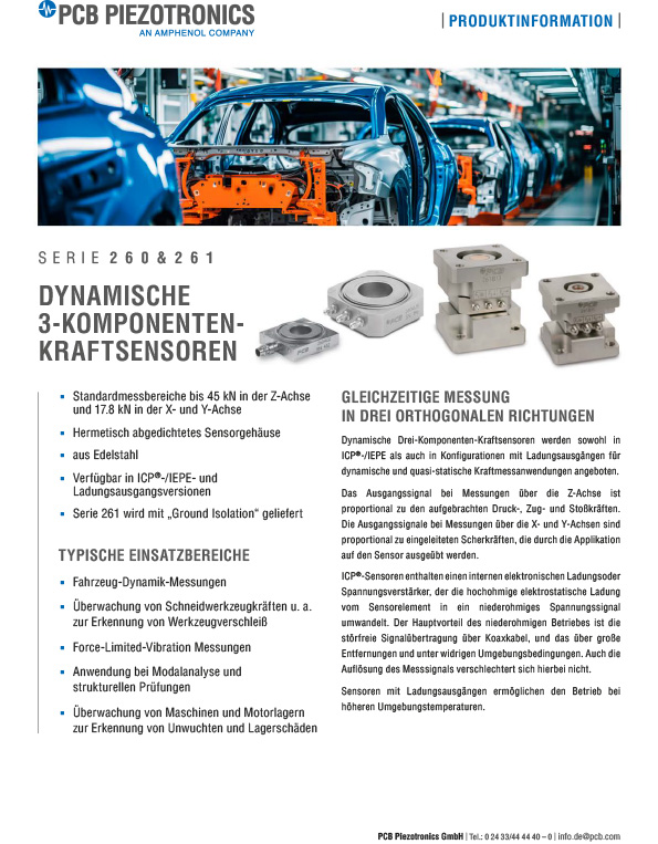 Die triaxialen Kraftaufnehmer der Serien 260und 261 mit ICP®- oder Ladungsausgang messen simultan dynamische oder quasistatische Kräfte in drei Raumachsen und ergänzen bei Fahrzeuguntersuchungen Vibrationsmessungen. Sie liefern Informationen über die eingeleiteten Kräfte, die auf das Chassis einwirken. Einsatzgebiete sind Modal-, Belastungs- und Komfortuntersuchungen. Die Montage erfolgt zum Beispiel zwischen Schockabsorbern, Motoraufhängungen, Federbeinen oder hydraulischen Aktoren.
