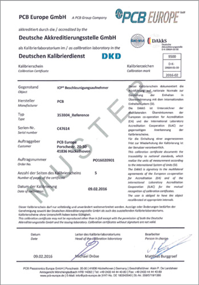 Ab sofort bietet PCB Synotech Kalibrierungen von Beschleunigungssensoren nach ISO 17025 an. Das am Standort Hückelhoven sitzende Kalibrierlabor der PCB Europe GmbH ist durch die Deutsche Akkreditierungsstelle GmbH (DAkkS) zugelassen und führt in unserem Auftrag die Dienstleistung durch.
