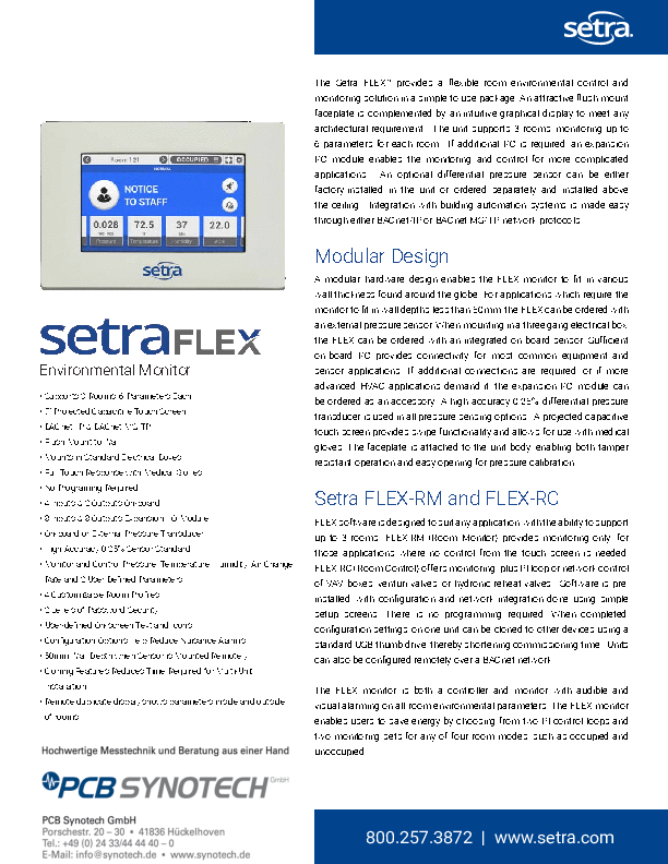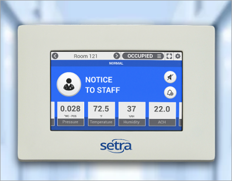 Mit dem Setra FLEX bietet Setra Systems einen neuartigen, flexiblen Raummonitor und Controller mit einem komfortablen 7 Zoll Touch Display an. Neben den wichtigen Parametern Druck, Temperatur und Luftfeuchte können weitere Parameter für bis zu 3 Räume überwacht und gesteuert werden. Setra FLEX kann über BACnet Protokolle einfach in eine Gebäudeautomation integriert werden. Top-Features