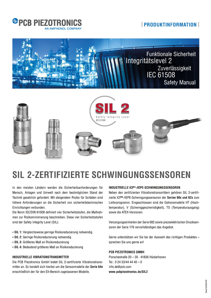 Mit steigendem Risiko für Maschinenschäden sind höhere Anforderungen an die Sicherheit von sicherheitstechnischen Einrichtungen verbunden. Die Norm IEC/DIN 61508 definiert vier Sicherheitsstufen, die Maßnahmen zur Risikominimierung beschreiben. PCB Piezotronics, Inc. bietet hierzu Sensoren und Versorgungseinheiten an, welche die Klassifizierung SIL2 aufweisen.