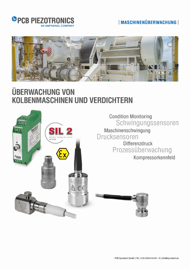 Die Broschüre Überwachung von Kolbenmaschinen und Verdichtern beschäftigt sich mit der Schwingungs- und Druckmessung an Kolbenkompressoren und Schraubenverdichtern. Sie gibt einen kurzen Überblick über die Bauformen und Kennlinien der Maschinen und beschreibt die Notwendigkeit des optimalen Betriebspunktes. Darüber hinaus zeigt sie im Ansatz die typischen Maschinenfehler anhand von Fehlerbildern. Abschließend werden geeignete Schwingungs- und Drucksensoren für den industriellen Einsatz vorgestellt und in ihrer Funktionsweise beschrieben.