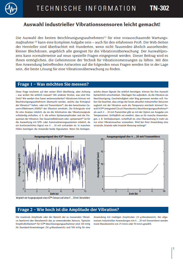 Die Auswahl eines geeigneten Schwingungssensors für den Einsatz im Bereich der Maschinendiagnose kann eine recht komplexe Aufgabe sein, auch für erfahrene Profis. Die TechNote TN-302 leitet den Anwender durch die Beantwortung von nur 9 Fragen zum richtigen Sensor und stellt dabei sicher, dass alle wesentlichen Aspekte bei der Auswahl des Schwingungssensors berücksichtigt werden.