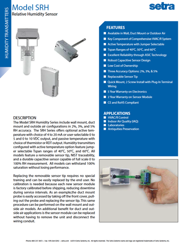 Das Modell SRH hat einen kapazitiven Sensor und ermittelt die Luftfeuchte im Bereich von 0 … 99 % mit einer Genauigkeit von wahlweise 2%, 3% oder 5%. Der integrierte Temperaturfühler arbeitet im Bereich zwischen -40 und +60 °C, wobei die Messspanne über Jumper eingestellt wird. Das Gerät ist in den Ausführungen für Wand- oder Kanalmontage erhältlich.